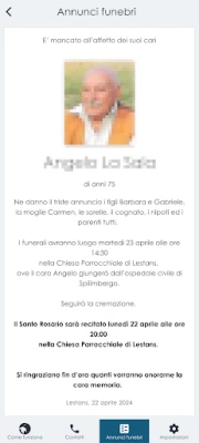 Se hai saputo della scomparsa di qualcuno (tramite necrologio, via email, social network o ricerca su internet) qui trovi le informazioni relative alle celebrazioni. Inoltre puoi inviare gratuitamente e in modo molto semplice un messaggio di cordoglio. Le tue condoglianze verranno consegnate ai famigliari anche in forma cartacea. E' anche possibile ricevere notifiche in tempo reale all'inserimento di un nuovo annuncio di un'impresa di uno o più comuni selezionati.