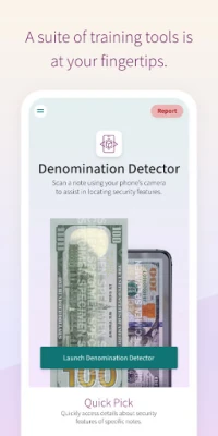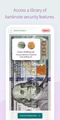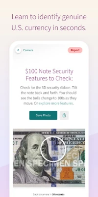 With Cash Assist’s unique suite of tools, you can learn to quickly locate and understand the security features of the Federal Reserve notes in your hands. Use your phone’s camera, accelerometer, and more to help you authenticate U.S. currency. You can even check bills in “hands-free mode” for extra discretion at the point of sale.