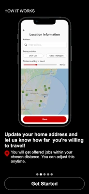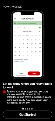 Download the app, send the request and complete the onboarding. Then, set your work radius and turn your availability toggle to "on" to start getting job offers.