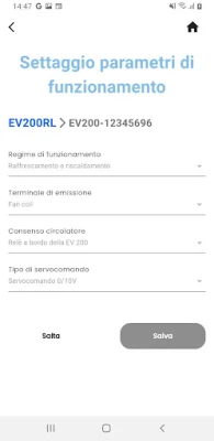 L’interfaccia intuitiva permette di accedere facilmente a tutte le impostazioni della centralina, con supporto completo per la gestione dei profili impianto e dei parametri di controllo. Non è richiesto alcun login: l’app è subito pronta all’uso. Ideale per tecnici installatori, manutentori e professionisti HVAC, ma disponibile per chiunque utilizzi la centralina EV200. Tutte le funzionalità sono accessibili liberamente e pensate per facilitare il lavoro sul campo.