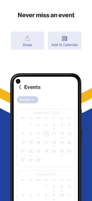 NEVER MISS AN EVENT The event section shows a list of events throughout the district. Users can add an event to your calendar to share the event with friends and family with one tap.