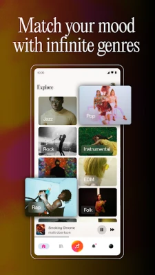 • Stay inspired by listening to tracks created by other users and explore the best AI music across genres like rock, rap, hip hop, pop, and more.